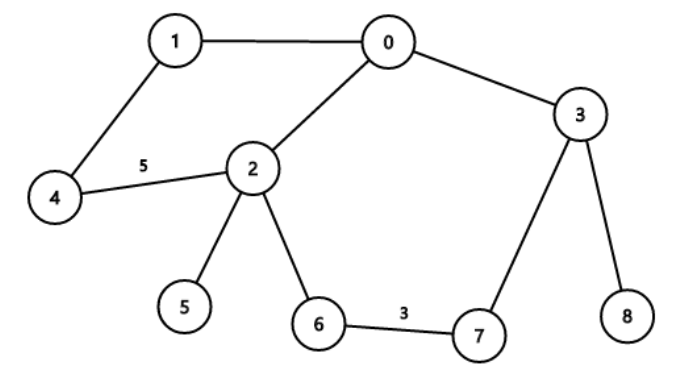 最优方案之一为路径 $4 \to 1 \to 0 \to 2 \to 5 \to 2 \to 6 \to 7 \to 3 \to 8$,总边权为 。不存在总边权更小的能够经过每个点至少一次的路径。
